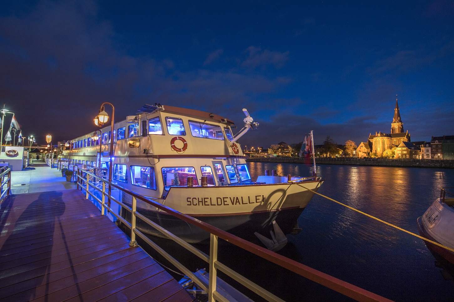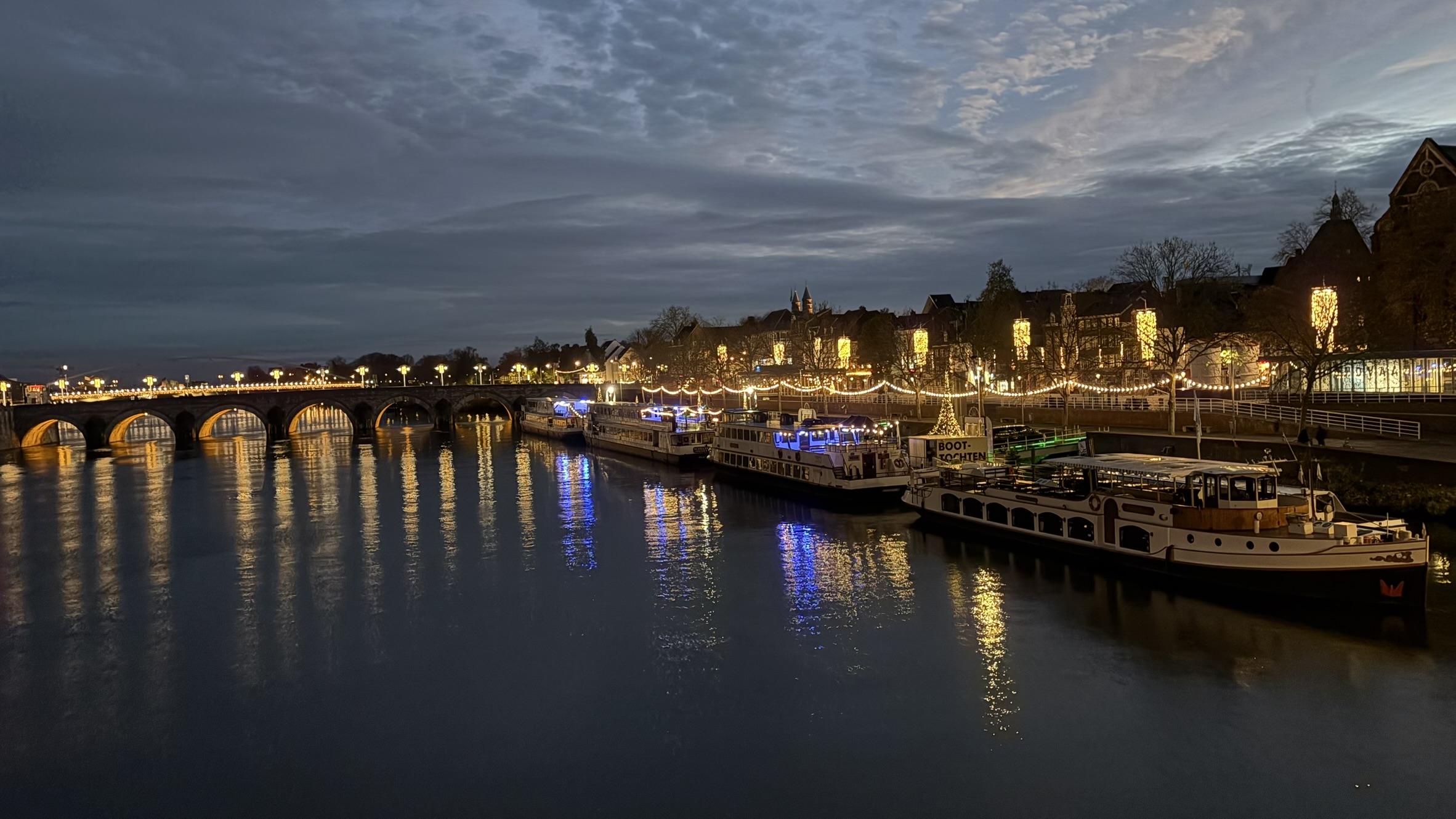 Le bateau doucement illuminé, le décor hivernal de Maastricht et la tranquillité de l’eau forment le cadre parfait pour une soirée pleine d’émotions. Un moment pour ralentir, profiter et partager ensemble la magie de Noël.